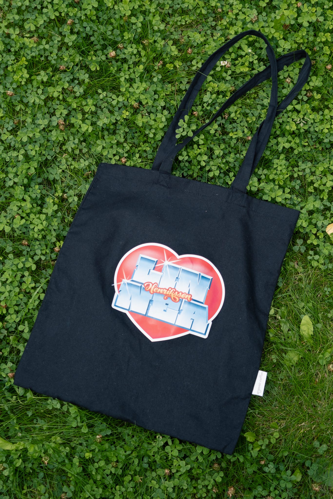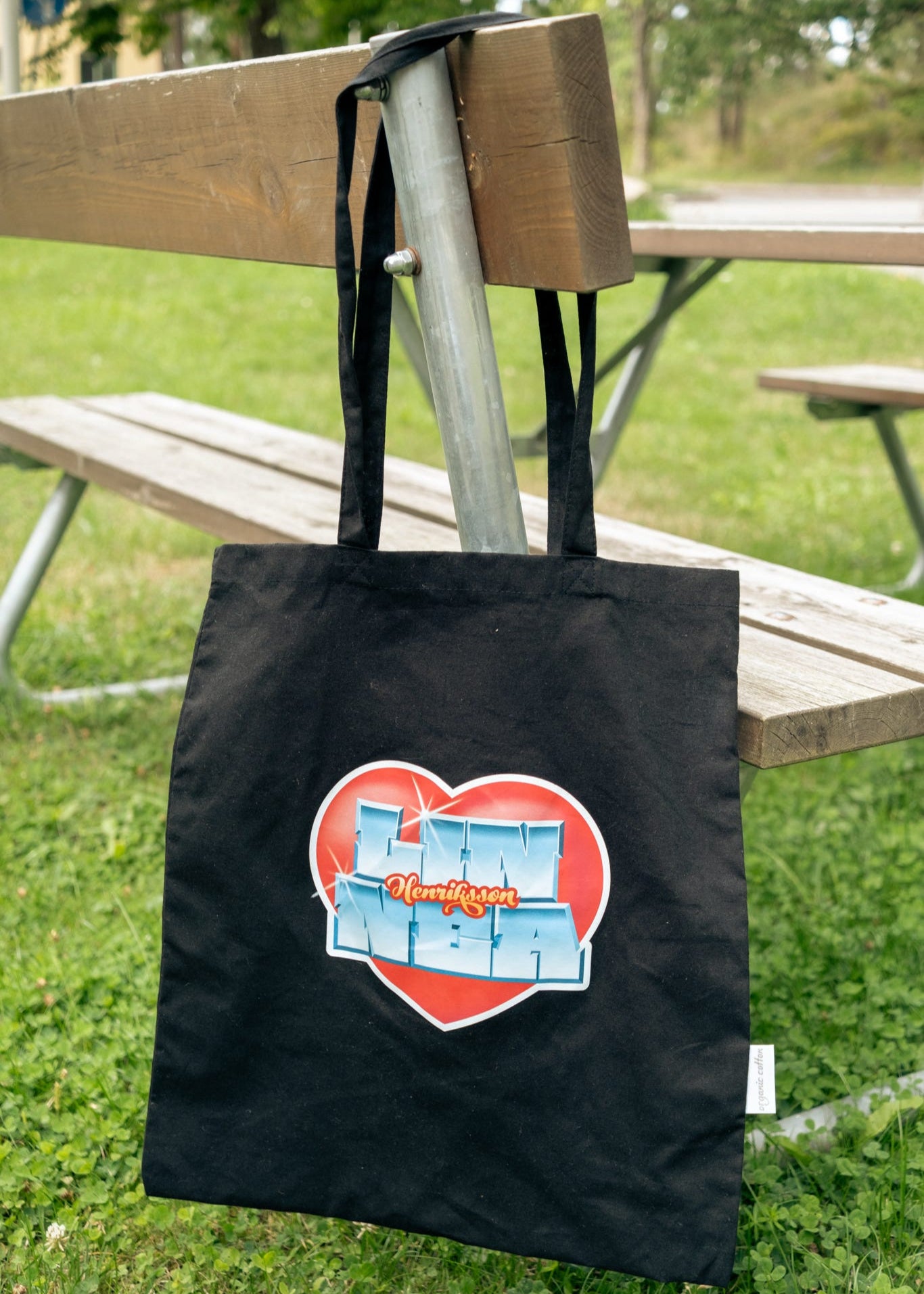 Den perfekta väskan för alla som älskar Linnea Henriksson. Design av Johan Toorell. Ett stort rött hjärta med Linnea Henriksson skrivit ovanpå. En riktigt slitstark svart väska i ekologisk bomull.